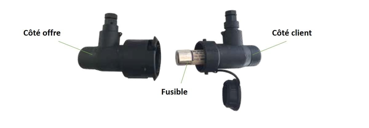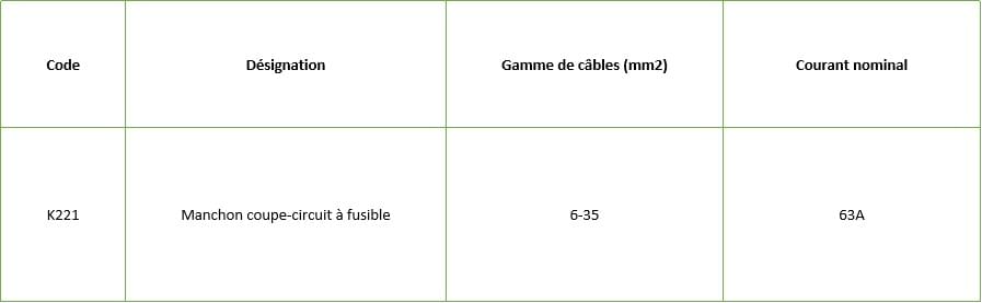 - Le manchon accepte des fusibles de calibre 63A. Le calibre 100A est accepté uniquement avec un câblage cuivre 35mm²